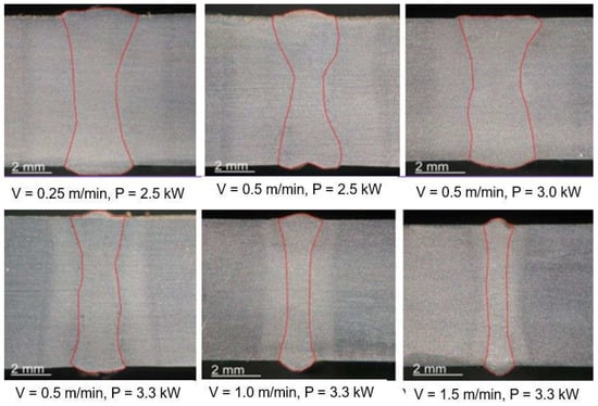 The effect of the TruDisk 3302 disk laser keyhole welding parameters, welding speed—V and laser beam power—P, on the shape and quality of the weld beads of butt welded joints of S335 steel sheets 6.2 mm thick. The TEM00 laser beam was focused on the top surface of the joint. Focal length—223.0 mm and focus dia.—80.0 μm. Argon shielding gas, flow rate—10.0 L/min [1].