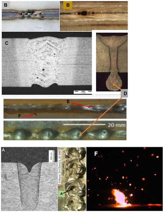 A view of typical external defects of laser-welded joints: (A) sharp concavity of the weld face (blow-out), (B) burn-through, (C) undercuts on the face and root side of the butt joint, (D) weld metal root sagging, (E) root humping/sagging, (F) metal spatter [1,23,24,25,26,27,28,29].