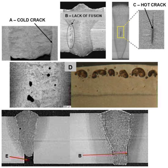 A view of typical internal defects of laser butt welded joints: (A) cold crack, (B) lack of fusion—no melting with the wall of the welded joint, (C) hot cracks, (D) porosity of the weld metal and under weld face, (E) lack of penetration [1,23,24,25,26,27,28,29].