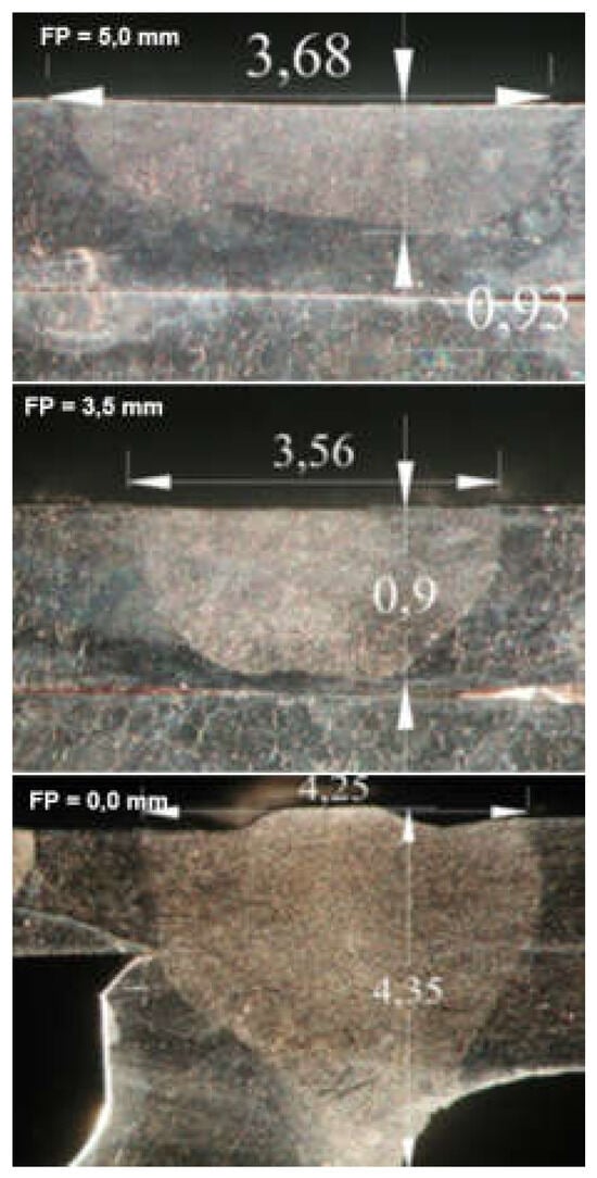 The position of the laser beam focus relative to the top surface of the laser-welded joints determines the shape and depth of the welded joint penetration, as shown in Figure 9, Figure 10 and Figure 15. Any change, even small, in the position of the laser beam focus over or below the top surface of the welded joint causes the absorption area of the laser radiation to increase, so the real power density of the laser beam decreases and the shape of the penetration changes. The higher the quality of the laser beam (minimal BPP), the smaller this change is, due to the smaller deflection angle of the laser beam in the far field, ΘG, as shown in Figure 1. The position of the laser beam focus in the laser melt-in welding process has a lesser effect on the weld bead shape than in keyhole welding, mainly due to the much lower laser beam power densities used in the melt-in laser welding processes. Changing the position of the laser beam focus above and below the surface of the welded joint in both cases increases the weld bead width and decreases the penetration depth, as shown in Figure 10 and Figure 18. Thus, in the process of laser melt-in welding, it is usually recommended to focus the laser beam on the top surface of the welded joint. The optimal shape and high quality of laser keyhole welded joints are ensured when the position of the laser beam focus is on the top surface of the joint or inside the joint, at a depth equal to 10–30% of the welded joint thickness. For high-quality laser beams (TEM00 and minimal BPP) and welded joint thicknesses up to about 5.0–6.0 mm, it is recommended to focus the laser beam on the top surface of the joint, and for thicknesses above 6.0 mm, in the range of 1.0 to 3.0 mm below the top surface of the joint [1,5,6,7,8,9,22].