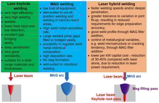 A comparison of advantages of laser keyhole welding, MAG welding, and laser + MAG hybrid welding [1].