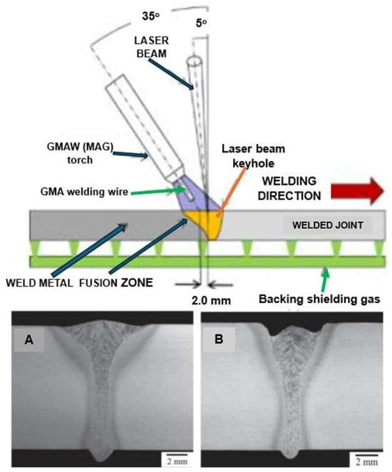 A schematic diagram of the LHW process with LASER beam leading mode. Welded joint macrostructures: (A) laser beam leading LHW, (B) MAG arc leading LHW [1,20].