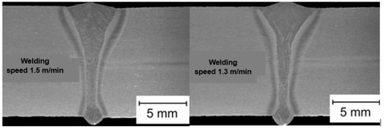 Macrostructure of LHW welded butt joints of EH36 marine low-alloy steel plates, 12.0 mm thick. Welding parameters: fiber laser YLR—10,000, beam power—8.0 kW, beam diameter—0.4 mm, focus position below the top surface of the plate—8.0 mm, ESAB Aristo power source—MAG (DC+) welding, solid wire 1.2 mm. Welding speed—1.5 m/min, wire feed speed—9.0 m/min. Welding speed—1.3 m/min, wire feed speed—10.0. For both welding speeds, the arc voltage is 33.0–33.8 V, the wire distance from the laser beam is 3.0 mm, the shielding gas is Ar + 18% CO2, and the flow rate is 20.0 L/min [7].