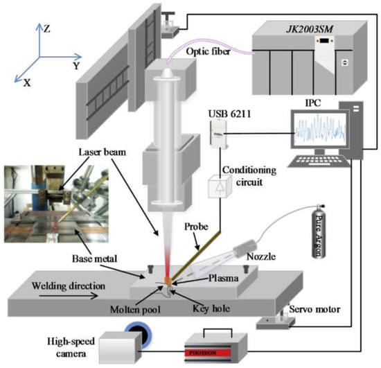 The schematic diagram of the experimental system of data acquisition of laser hybrid welding process employing a passive probe made of copper to acquire the electrical signal of laser-induced plasma, the high-speed camera (FASTCAM Super 10 KC, PHOTRON) serving to observe the dynamic behavior of plasma plume with a frame rate of 5000 fps [35].