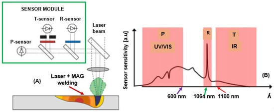 Typical laser keyhole welding online quality monitoring system using photodiode sensors for electromagnetic radiation registration: (A)—the system of photodiode sensors and optical filters recording the radiation of the welding area, (B)—the course of changes in the radiation intensity of three photodiode sensors, P—plasma cloud radiation: ultraviolet and visible radiation (UV/VIS) of 200–750 nm, R—laser beam reflection radiation, T—infrared radiation, wavelength 1100–1700 nm, Figure 29 [23].