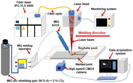 The schematic diagram of the experimental system of high-power LHW MIG leading process of AISI 304 steel sheets 4.0 mm thick for quality monitoring and weld defect detection using a high-speed imaging system that could observe the visual information from the top and bottom of the welded joint simultaneously [40].