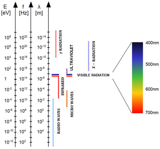 The range of energy—E eV, frequency of radiation—f Hz, and the length of the primary electromagnetic waves—λ m. Laser radiation used in welding is in the wavelength range from approx. 800 nm to 10.6 µm [1].