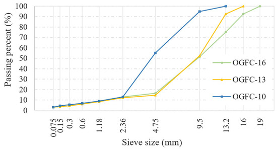 Limestone aggregate from Shaanxi Lianhuasi (Xi’an, China) stone material factory was used to prepare the specimens. The coarse aggregate had a crushing value of 22% and a flat-elongated particle percentage of 8%, both of these meeting the requirements outlined in the Technical Specifications for Construction of Highway Asphalt Pavement JTG F04-2004 [28]. The tests were conducted in accordance with the Test Method of Aggregate for Highway Engineering JTG 3432-2024 [29]. The gradation is shown in Figure 1, and the optimal asphalt content for OGFC-10, OGFC-13, and OGFC-16 was determined to be 5.2%, 4.9%, and 4.7%, respectively.