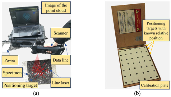 A portable 3D scanner (HandySCAN 300, Creaform, Lévis, QC, Canada) was used to scan the specimen and capture the three-dimensional surface texture, as shown in Figure 2. The scanner offers a resolution of 0.1 mm and an accuracy of 0.04 mm. Before scanning, positioning targets were strategically placed on the surface of the specimen to record their relative positions based on the geometrical relationship of the angles of departure and arrival in the scanner (Figure 2a). These positioning targets serve a similar purpose to benchmarks in surveying. When the laser scans the pavement surface and the field of view includes four or more positioning markers, the software calculates the elevation of the corresponding positions based on the predetermined sampling interval. A calibration using a plate with positioning targets of known relative positions (Figure 2b) is required if there is a considerable time interval between scans or significant environmental changes. After obtaining the surface macrotexture data, the form and roughness out of the range of the pavement macrotexture were removed and filtered, with upper and lower wavelength limits set to 50 mm and 0.5 mm, respectively.