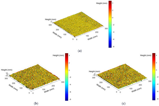 Figure 3a–c shows the 3D surface data reconstructions of the OGFC-10, OGFC-13, and OGFC-16 specimens, respectively. Noticeable differences in the macrotexture roughness of mixtures with varying gradations are evident. As the maximum particle size decreases, the surface protruding points become denser; additionally, the color bars on the right side of each image in Figure 3a–c are the same; surfaces with colors closer to the upper side of the color bar have the greater height difference. Therefore, larger maximum particle size results in greater height differences between the lowest and the highest points on the OGFC surface.