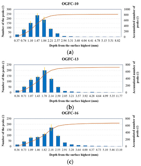 Moreover, for OGFC-10, OGFC-13, and OGFC-16, at 62%, 45%, and 42% of the whole depth range, respectively, the number of peaks no longer increases. At a depth of 1.4–1.5 mm from the surface, the cumulative peaks of OGFC-10, OGFC-13, and OGFC-16 account for 60%, 45%, and 32% of the cumulative number of peaks on the corresponding surface. This indicates that the peaks in OGFC-10, with the finer gradation and lower profile depth, are more likely to be distributed closer to the surface. In contrast, peaks in OGFC-16 are mainly distributed at greater depth, likely because the higher roughness of coarser gradation causes fine aggregates to deposit deeper within the surface.