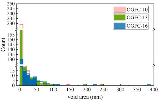 After image segmentation, the voids, indicated by the blue area in a cross section of the asphalt mixture, can be extracted as shown in the dark area (Figure 6). The void area of OGFC-10 was the smallest, gradually increasing with the coarser gradation, aligning with the measured porosity. Quantitatively, the void areas were calculated using Equation (9) to assess the internal macrostructure.