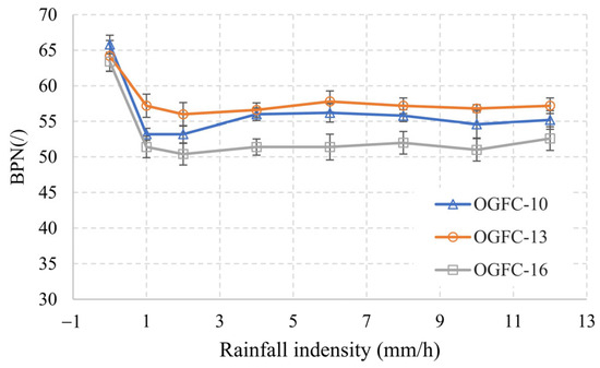 Changes in BPN values of OGFC specimens with rainfall intensity.