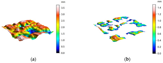 Extracting surface contact area for surface feature parameter calculation. (a) Original surface, (b) extracted contact areas.