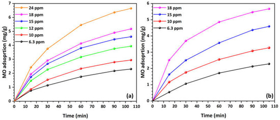 As shown in Figure 1a, MO adsorption increases over time for all concentrations, with the process being rapid initially and then slowing down as it approaches equilibrium. Higher initial MO concentrations result in greater adsorption capacities. Specifically, the adsorption curves for higher concentrations (18 and 24 mg/L) rise more steeply and achieve higher adsorption values compared to lower concentrations (6.3 and 10 mg/L). Higher concentrations also take longer to reach equilibrium compared to lower concentrations. It may be inferred that the adsorption process is concentration-dependent, with higher concentrations leading to higher adsorption capacities and a slower approach to equilibrium.