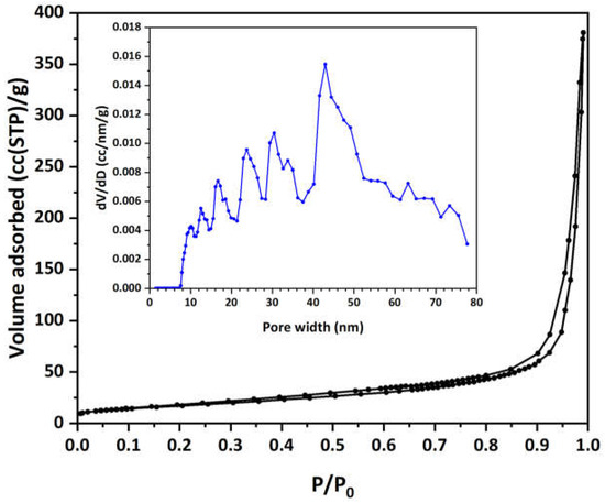 Finally, a concise analysis of the pore structural properties of the Cu-CuO/TiO2 nanocomposite at the end of this section would be beneficial. Figure 2 shows the LN2 porosimetry isotherm for the material revealing a type IV isotherm with a clearly observed hysteresis loop, characteristic of mesoporous materials [83]. The adsorption volume significantly increases at higher relative pressures (P/P0), indicating the existence of prominent mesopores or macropores. The inset of Figure 2 displays the pore size distribution (PSD), which was obtained from the LN2 isotherm desorption branch using the non-local density functional theory (NLDFT) method. The NLDFT analysis employed an equilibrium kernel for silica as the adsorbent and N2 77 K as the adsorbate. The PSD presents a range of pore widths predominantly between 10 and 70 nm, with notable peaks around 10–15 nm and 30–40 nm, and a broader peak near 45 nm, indicating a wide distribution of pore sizes within the mesopore range. The extension up to 70 nm indicates a significant presence of macropores on the HFs. This suggests that the copper decoration and residual carbon on the HFs have created a hierarchical porosity structure, enhancing the adsorption capacity of MO by effectively facilitating the surface adsorption and diffusion of MO molecules.