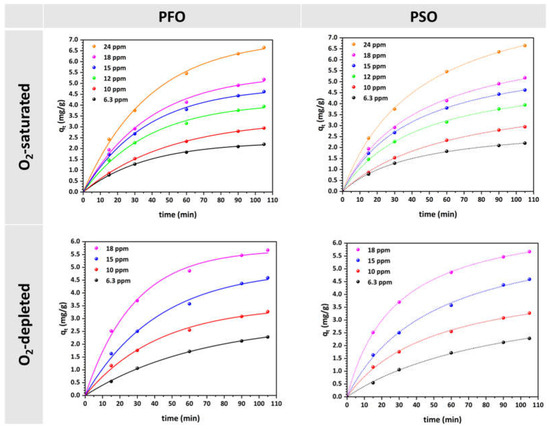 Figure 3 displays the experimental data utilized to fit the non-linear PFO and PSO kinetic models for the adsorption of MO in solutions that are saturated with O2 and depleted of O2. The kinetic parameters values obtained from these models are listed in Table 1.