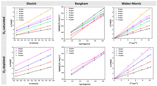 Likewise, the experimental data collected at various MO concentrations were fitted to the Elovich, Bangham, and Weber–Morris kinetic models (Figure 4). The calculated values of the kinetic parameters are shown in Table 1. In Figure 4, the linear relationships depicted by the Elovich model are evident, with each line’s slope and intercept differing based on the concentration and oxygen conditions in the solutions. In both cases, higher concentrations generally result in steeper slopes, indicating faster adsorption rates.