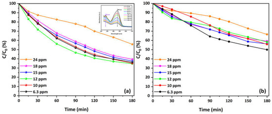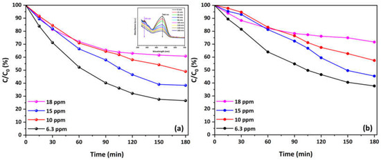 Moreover, Figure 6 illustrates the kinetics of MO degradation in O2-depleted solutions using Cu-decorated HFs at various concentrations. Both the main (Figure 6a) and secondary (Figure 6b) absorbance peaks decrease over time, indicating effective photocatalytic degradation of MO under these conditions. The degradation rate is more pronounced at lower concentrations (6.3 and 10 mg/L), with a noticeable decrease in C/C0 values over 180 min. The main peak shows 73.5% degradation at 6.3 mg/L concentration and decreases to 40% at the highest concentration (18 mg/L). Similarly, the secondary peak presents a reduction from 62% to about 30% degradation. The inset plot at a concentration of 10 mg/L reports the decrease in both the primary and secondary absorbance peaks during the photocatalytic process, therefore validating the observed degradation pattern.