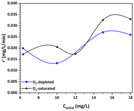 Moreover, Figure 7 illustrates the plots of the initial degradation rate r’ against the initial MO concentration in both O2-saturated and O2-depleted solutions, revealing a non-linear relationship. In the O2-saturated solution, the initial degradation rate generally remains stable with slight fluctuation until 12 mg/L. Beyond this point, the rate nearly doubles and stabilizes at very high concentrations after the 15 mg/L, indicating optimal conditions for degradation and possible saturation of active sites on the catalyst. This observation implies that the presence of dissolved oxygen enhances the degradation process, likely by providing sufficient electron scavengers to facilitate the reaction. Conversely, in the O2-depleted solutions, the initial degradation rate is consistently lower than in the O2-saturated solutions, except at a concentration of 6.3 mg/L, and follows a different trend. The rate initially decreases slightly as the concentration increases, suggesting that the lack of oxygen significantly limits the degradation process by reducing the efficiency of electron transfer and scavenging. However, after reaching a minimum point, the rate begins to rise by up to 35% compared to the lowest concentration, indicating that at higher concentrations, other mechanisms might contribute to degradation (e.g., reductive cleavage of the azo group), or that the system approaches a different kinetic regime. Overall, these observations highlight the critical role of dissolved oxygen in influencing the photocatalytic degradation rates and the complex interplay between concentration and reaction kinetics.