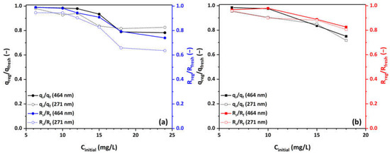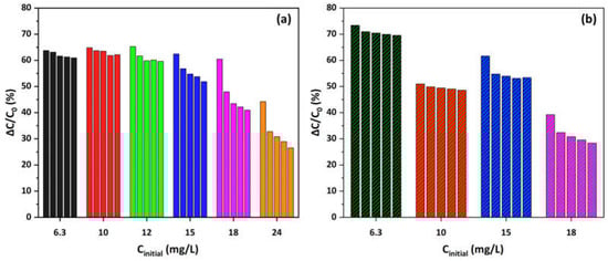 To assess the MO adsorption capacity of the Cu-CuO/TiO2 nanocomposite, a range of initial MO concentrations was firstly tested in O2-saturated solutions, as illustrated in Figure 1a. The MO adsorption capacity ranged from 2.3 mg/g to 6.7 mg/g at the highest concentration (24 mg/L). As previously illustrated in our prior work [62], decorating HFs with nanoparticles of zero-valent copper and/or copper oxide improved their pore structural and surface texture characteristics leading to an enhanced MO adsorption capacity. In addition, the presence of residual carbon enhances the adsorption capacity through π-π dispersion interactions between the MO and the photocatalyst [63,64], as well as the electron donor–acceptor complex mechanism [65,66,67]. This condition serves a dual purpose: first, it results in the accumulation of pollutant on the photocatalyst’s surface, and second, it weakens the bonds of the adsorbed molecules [64].