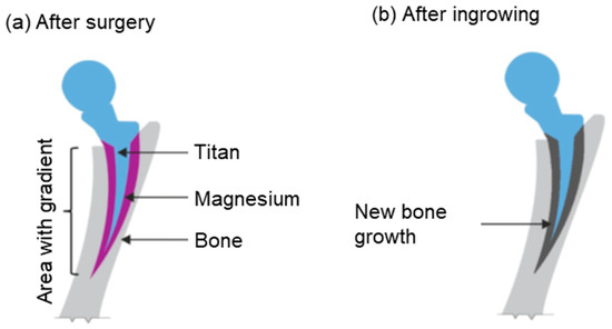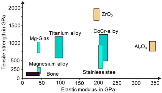 Because magnesium has positive effects on bone growth, the combination of the materials magnesium and titanium within a hybrid implant is suitable. It leads to a significant improvement in usage properties, such as ingrowth behavior and longevity [3]. This is caused by the similar strength properties between magnesium alloys and human bone; see Figure 1 [4].