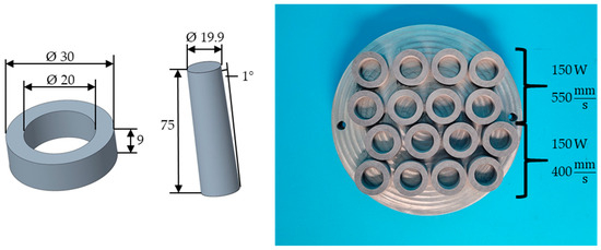 The AZ91D sleeves were produced on an AconityMIDI (Aconity3D GmbH, Herzogenrath, Germany) equipped with a laser of 1070 nm wavelength with a focus diameter of 80 µm, under an argon atmosphere. A layer thickness of 30 µm and a hatching distance of 60 µm were used for all 16 components, whereby the substrate plate was not preheated. Before manufacturing the sleeves, suitable process parameters were determined in a previous test using a parameter matrix in which the laser power was varied between 150 W and 225 W in 25 W steps and the exposure speed between 400 mm/s and 850 mm/s in 150 mm/s steps. The two parameter sets of 150 W and 400 mm/s (sleeves 17 to 24) and 150 W and 550 mm/s (sleeves 25 to 32), which had the lowest porosity, were subsequently used to produce eight sleeves each. These were used to further realize and analyze a joint between Ti-6Al-4V and AZ91. Due to the use of the same manufacturing parameters, it can be assumed that sleeves 17 to 24 and sleeves 25 to 32 have approximately the same porosity of 0.77% and 0.44%, respectively, and surface quality (Figure 3).