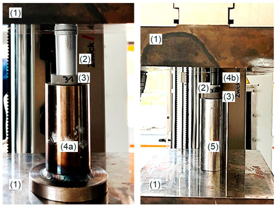 The samples were pressed on and pushed out using the Zwick Z250 (ZwickRoell GmbH & Co. KG, Ulm, Germany) available at the Department of Hybrid Manufacturing. The associated test setup is shown in Figure 4.