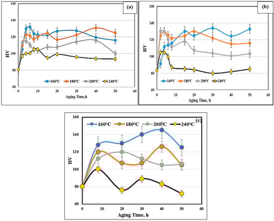 Figure 2 shows the effect of Sr and Ni addition on the aging behavior of the 354 alloy in the temperature range of 160–240 °C and for aging times varying from 0 to 50 h, with 0 h representing the T4 heat treatment. The samples were solutionized at 495 °C for 5 h prior to quenching in warm water (60 °C); 0 h corresponds to T4) [,,].