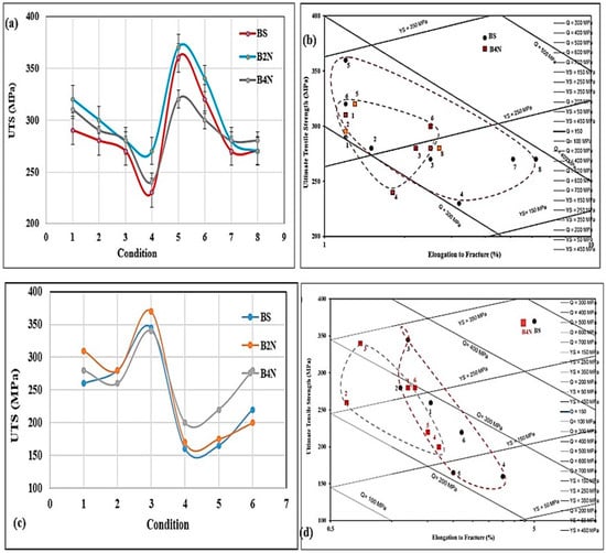The microstructure shown in Figure 2c for the B2N alloy reveals a large volume fraction of Ni-based phases. Whereas it is known that Cu and Ni can dissolve in each other, producing Cu–Ni compounds that are insoluble in the surrounding Al matrix (marked X). Figure 3a depicts the variation in the ultimate tensile strength (UTS) of the three studied alloys (i.e., BS, B2N, and B4N) following different aging treatments as described in Table 2a. As can be seen, the highest resistance to softening is associated with alloy B4N in the T5- and T7-treated conditions. The lowest values were obtained in the T5- and T7-treated conditions for BS and B2N alloys.