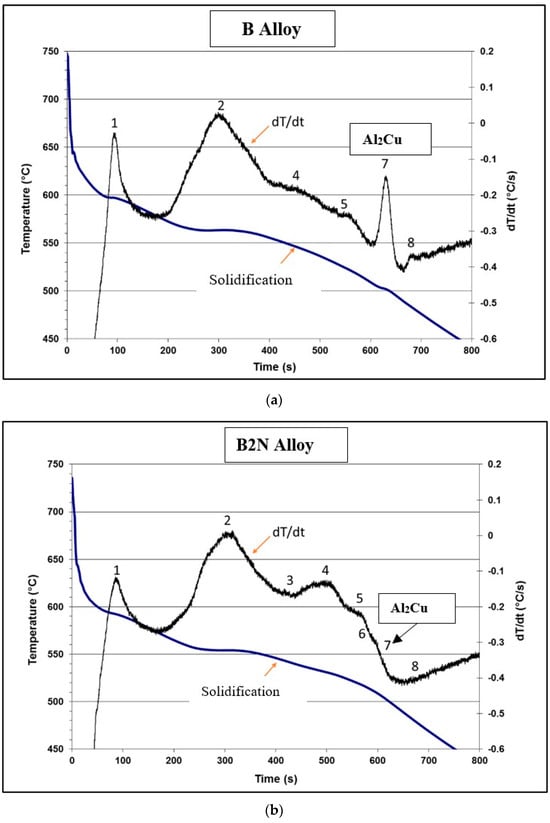 (a) Solidification curve (blue) and its first derivative (black) obtained from alloy B. (b) Solidification curve (blue) and its first derivative (black) obtained from alloy B2N (containing 2 wt% Ni + 0.25 wt% Zr). (c) DSC solidification curves of the BS alloy (see Table 6 for reactions).