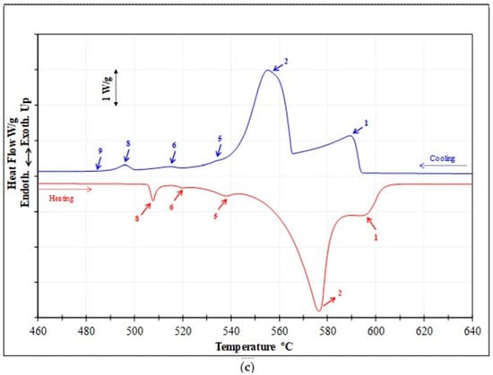 DSC solidification and melting curves of the base BS alloy studied are provided in Figure 5c, displaying the suggested endothermic and exothermic transformation reactions. These reactions are listed in Table 6.
