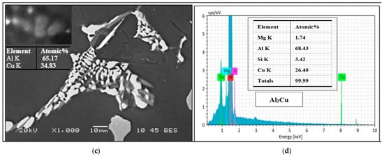 Garza-Elizondo and coworkers [] reported that in the 354 alloy they investigated, the as-cast structure displayed DAS or dendrite arm spacing values of 50–70 um when the alloy was solidified under equilibrium solidification conditions. Such conditions were also adopted in the present study. The as-cast microstructure of the BS alloy displayed in Figure 7a shows a large amount of Al2Cu precipitates surrounded by fine Al–Si eutectic regions. The EDS spectrum taken from X in Figure 7c, depicting a concentrated region of Al2Cu particles in the alloy, also exhibits a peak due to Mg, which indicates the possible presence of the Q-Al5Cu2Mg8Si6 phase, as listed in Table 3 and shown in the inset micrograph at the top left in Figure 7c.