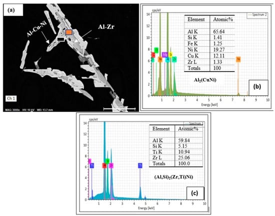 It may be inferred from the Al–Zr binary phase diagram that the melting temperature of Al-0.3% Zr is about 750 °C. Therefore, in the present work, the temperature of the melt was raised to 820 °C to allow for the dissolution of Zr. Thereafter, the temperature was lowered to 750 °C before starting the degassing process. During solidification and before reaching the peritectic reaction at 660 °C, primary Al3Zr particles would precipitate in the form of dispersoids [,,]. Figure 8a shows that in the B2N alloy, it is possible that Al–Ni–Cu compound may precipitate, covering the Al3Zr particles. In addition, Ni would also react with Zr, forming Ni5Zr compound [,]. On the other hand, Cu would react with both Ni and Zr (Cu9Zr2) [,]. Figure 8b is the EDS spectrum corresponding to the black rectangular area in Figure 8a, revealing peaks of Al, Ti, Cu, Zr, and Ni, whereas the EDS spectrum obtained from the orange square reveals strong Zr peaks, as seen from Figure 8c.