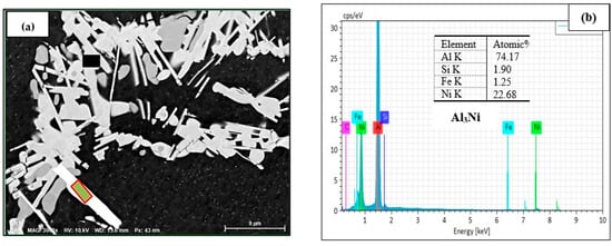 Nickel (Ni) has a relatively lower contribution to the alloy mechanical performance of aluminum–silicon (Al–Si)-based alloys compared to that produced by the addition of copper (Cu) and magnesium (Mg). Nickel has traditionally been used in a proportion of 2–3% because it was believed to improve the mechanical properties of alloys used at high temperatures [,,,]. The nickel compounds dispersed inside the microstructure suggest that the mechanical properties are improved by the presence of nickel [,,,]. However, the inter-particle spacing of Al3Ni compounds being considerable, of the order of 50 µm, this large distance would not allow perceptible dispersion hardening. Furthermore, it could be possible that the nickel compounds are formed via a fiber hardening process, but this would not make a significant contribution since the network of silicon fibers in large volume would annihilate this effect of nickel [,,,].