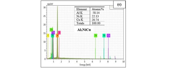 The use of Ni is limited to alloys used in atomic reactors due to its high neutron absorption, but in other applications, its addition is desirable: combined with Fe, for example, it improves resistance to high vapor pressure corrosion []. It was reported that the addition of Cu (1.0 to 1.8%) and Ni (1.0 to 1.6%), or just Cu, to eutectic Al–Si alloys produces multicomponent phases of the following types: Al40Si7(Fe,Mn)11Cu, Al40Si4Fe2MnCuNi11, and Al40Si(Fe,Mn,Cu,Ni)13 [,,,].