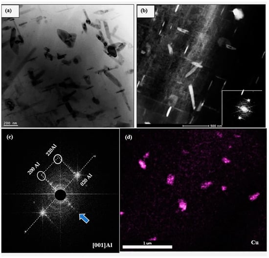 TEM micrographs of the B alloy aged at 240 °C for 50 h: (a) bright field, (b) dark field electron images, (c) the selected area electron diffraction (SAED) pattern obtained from the precipitates in (a)—note the presence of faint white spots (blue arrow). (d) X-ray image of Cu-rich particles in (a).