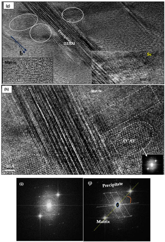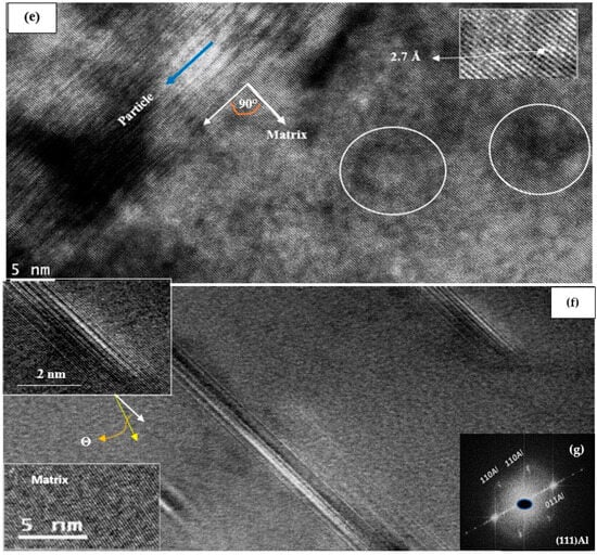 In this section, samples heat-treated in the T6 and T7 conditions will be discussed, in addition to those exposed to a prior stabilizing treatment for 200 h at 240 °C. Figure 10a,b presents the precipitation in samples in the underaged condition (8 h at 160 °C) showing ultra-fine precipitates. These precipitates are still coherent with the aluminum matrix, as inferred from the high-resolution images displayed in Figure 10c,d, revealing contrast-like areas around the coherent precipitates (white arrows). It has been proposed that due to the high degree of coherency, extensive coherency–strain fields are developed, leading to an increase in the peak strength of the alloy. Thus, the formation of θ” precipitates may lead to distortion in the lattice structure in, and around, their vicinity. These distortions will impede the movement of dislocations during plastic deformation, resulting in hardening effects [,,,,,,,,,,,].