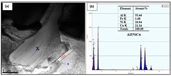Consider the atomic numbers of Fe, Ni, and Zr: 26, 28, and 40, respectively. The backscattered electron image presented in Figure 4e reveals the fracture of α-Fe in its dendritic shape similar to that featured in Figure 4d except for its grayer color when compared to the bright appearance of the Ni-based intermetallic phase due to the obvious difference in the atomic numbers of the two phases. The fracture surface depicted in Figure 4f demonstrates two main observations: the presence of the Al–Ni–Cu phase in the form of platelets coupled with a large density of fine Al2Cu particles. Since it is a fracture surface, it is difficult to estimate the density of the precipitates. Figure 4g and Figure 4h are the EDS spectra corresonding to Figure 4e and Figure 4f, respectively, obtained from the spots marked X in each case. Occasionally stacking faults were seen in the fracture surface, as displayed in Figure 4i.