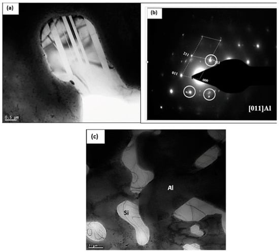 This present study is in continuity with the previous work carried out by the current authors [,,,] in order to explore in depth the role of the interactions between the alloying elements in determining the final phases in the microstructure of the Al–Si–Cu–Mg alloys [] and the extent to which they affect the alloy strength. Based on these studies, zirconium (Zr) will also be added to the base alloy containing 9%Si-2%Cu, 0.6%Mg, 0.15%Fe, followed by Ni addition, to study the combined effect of Zr on the strength properties of the 354 alloy at ambient and high temperatures. Transmission electron microscopic analysis will be used to monitor the changes in the size, density, and distribution of the precipitates formed and their crystallographic characteristics.