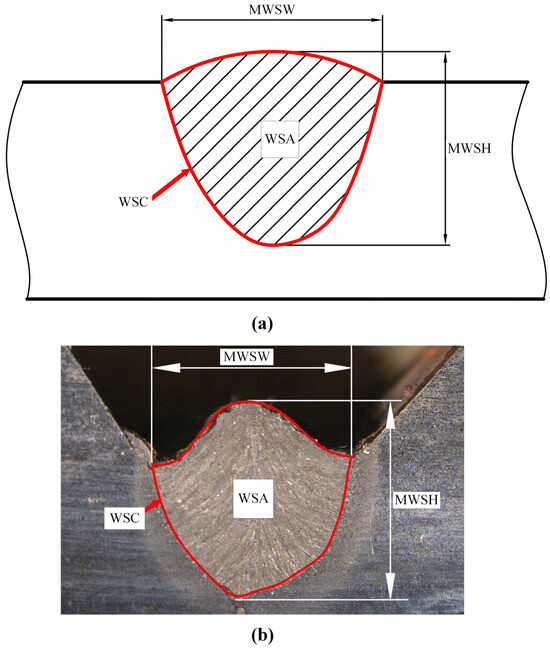 The weld bead cross-section morphology refers to the cross-section of the weld joint after completion. This process involves dissecting the welded joint, followed by using etching techniques to enhance the clarity of the weld bead’s structure, making it easier to observe and analyze the internal features of the weld bead [17]. Weld bead morphology is observed visually, primarily comprising geometric parameters of the appearance such as weld seam area (WSA), weld seam circumference (WSC), maximum weld seam height (MWSH) and maximum weld seam width (MWSW) as illustrated in Figure 2. Due to processes such as high-temperature heat transfer, melting and solidification, and metal phase transformation involved in welding [9,18], there exists a highly nonlinear relationship between welding process parameters and weld bead profiles. The characteristics of weld bead cross-section morphology are related to many factors; for instance, significant differences exist in weld bead cross-section morphology under different welding speed conditions [19]. And the other factors include the welding current and voltage, different welding methods, weld height, material properties, etc.
