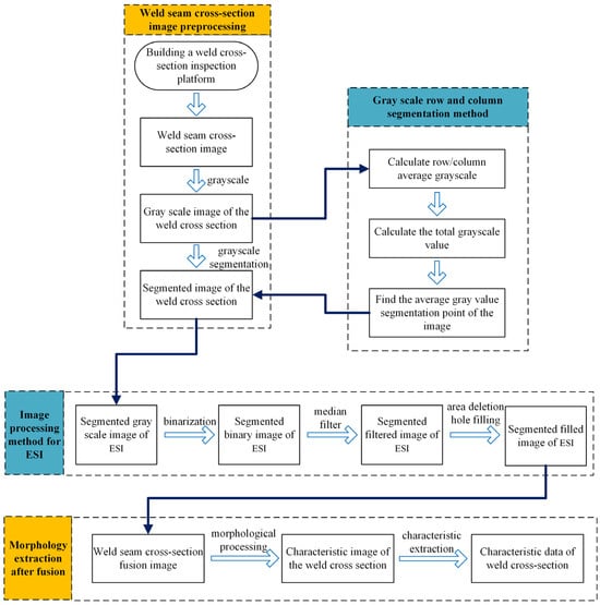 Shown in Figure 3, the technical approach of this paper involves establishing a welding seam detection platform, followed by obtaining the original images of the welding bead sections. These images are then grayscale-converted and subjected to row–column grayscale segmentation. Specifically, the segmentation method calculates the average grayscale value for each row and column in the grayscale image. The total grayscale value of the image is computed, and then, through iteration, the point of segmentation along a row/column is found where the total grayscale values of the upper/lower or left/right halves are equal. This point serves as the boundary for segmentation. After segmentation, the ESI is separately subjected to binarization and median filtering to retain only the main weld bead cross-section morphology. The segmented images are then recombined, and morphological processing is applied to remove irregularities along the edges. Finally, feature extraction is performed on the processed images to obtain welding bead characteristic data.