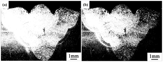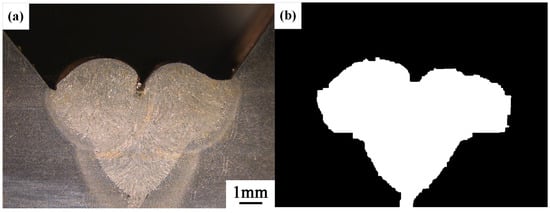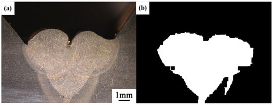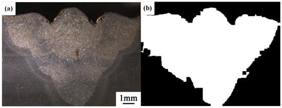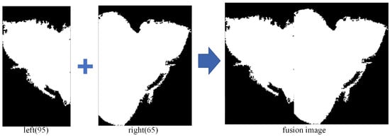 The results of processing the left and right sides are fused together, with a comparison made between the individually processed images to determine the one that best displays the weld bead cross-section morphology along with its corresponding threshold. Specifically, the threshold values selected were 95 for the left half image and 65 for the right half image, as shown in Figure 10.