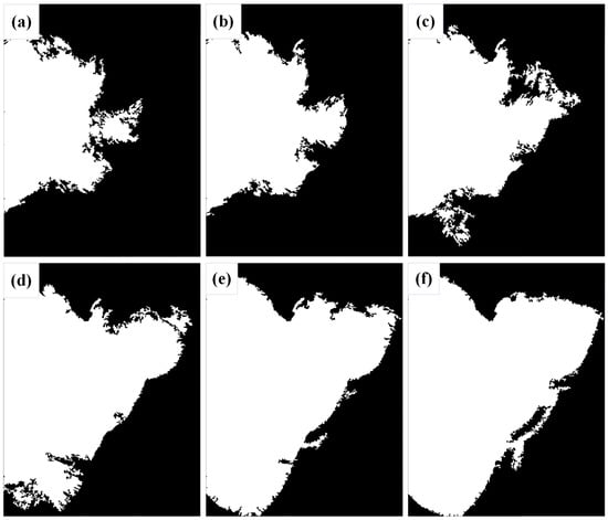 The right half binarized images with different thresholds: (a) 90, (b) 85, (c) 80, (d) 75, (e) 70, and (f) 65.