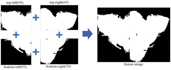 After image segmentation, binary processing is applied to the quadripartite images. The key is to determine the threshold range for each quadripartite image. By varying the binary threshold every 5 based on the original image, it is observed that a threshold of 90 maximally preserves the contour of the weld bead cross-section. Consequently, the binary threshold for the top-left quadripartite image is set to 90. Similarly, for the top-right, bottom-left, and bottom-right quadripartite images, the binary thresholds are set to 65, 95, and 70, respectively. The overall threshold sequence is (90, 65, 95, 70). This choice aligns with the characteristics of the image: brighter on top, darker on the bottom, brighter on the left, and darker on the right. The fusion image after processing the four quadripartite images is shown in Figure 11.