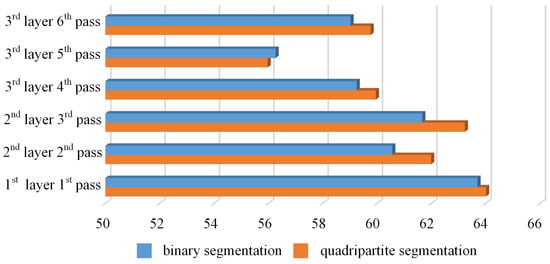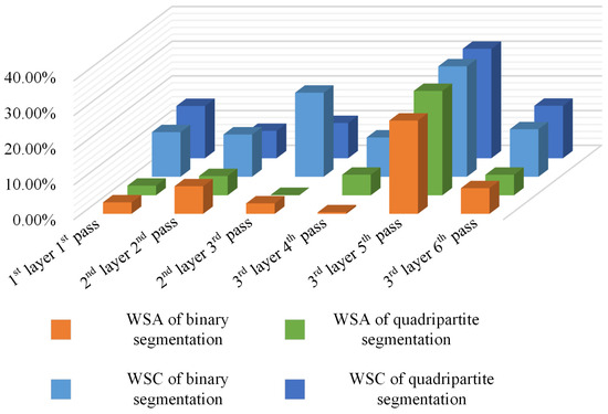Due to the observation that errors in the MWSH and MWSW are generally small, our primary focus is on errors in terms of WSC and WSA. The relative error is defined as the ratio of the absolute error of the contour data extracted using the method of this paper to the contour data of the original images. The relative errors of the multi-layer multi-pass images after the binary or quadripartite segmentation process are shown in Table 5 and Table 6. We can see a visual comparison in Figure 27.