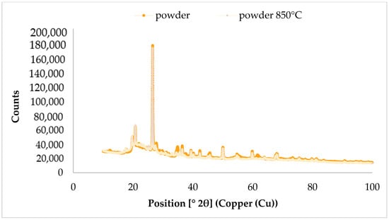 A particle size analysis was carried out for the diatomite powder, which showed that the powder in its raw form had an average particle size of 11.305 μm, while after calcination the material had a particle size of 14.691 μm. An increase in the particle diameter of diatomite after calcination at 850 °C was observed, and this is most likely caused by the permanent bonds formed during the thermal treatment and the presence of the liquid phase. Measurements of the average size of diatomite powder from Poland made by other researchers are very similar to those presented in this research work [,,].