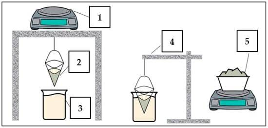 Diagram of test stand: (1) laboratory balance, (2) conical sieve, (3) test liquid, (4) tripod, and (5) test material.
