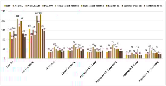Figure 6 shows the results of the absorption of paraffinic phase-change substances and two petroleum substances by diatomite. The results show that absorption of paraffinic substances by diatomite exceeding 200 wt.% is possible. To compare the absorption capacity of paraffins and petroleum substances, the sorption capacity of summer and winter crude oil was also studied. Analyzing the chart below, calcined diatomite powder has the highest sorption capacity, which is the diatomite with the smallest particle size. For granules and aggregates, the absorption results are similar, but calcined diatomite shows a higher sorption capacity in each variant. The best absorption results were obtained for calcined diatomite powder for two substances: liquid heavy paraffin from WARCHEM and paraffin oil from FLEXOL. The absorption results for these two test liquids are 227 and 233 wt.%, respectively. As for the absorbency of petroleum substances, the best results settle at 150 wt.%. Given this, it can be concluded that diatomite, which was previously used as a sorbent for absorbing petroleum substances, absorbs paraffinic phase-change substances much better. The results of this study confirm that diatomite can therefore be an excellent medium for paraffinic phase-change substances, which can be used as a construction aggregate in lightweight geopolymer foams, the study of which will be presented in the authors’ next work.