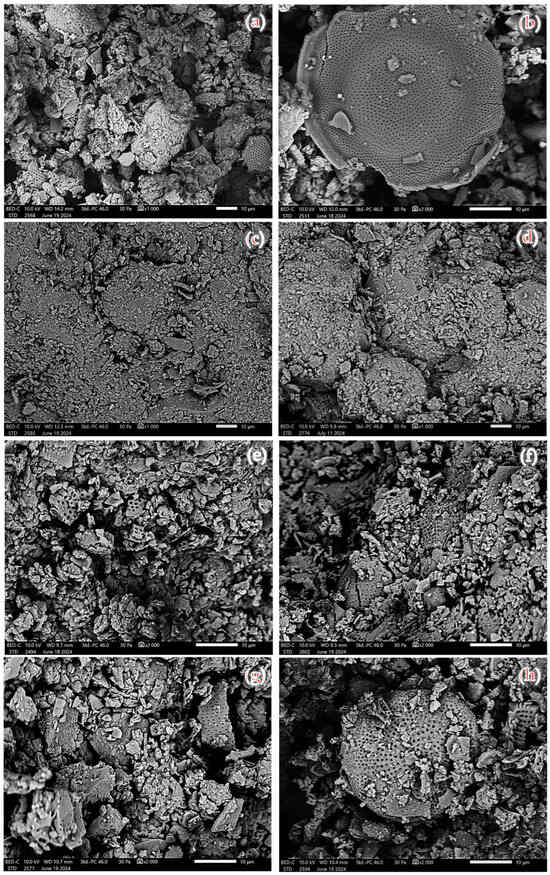 Images of the morphology of the samples of all diatomite variants were taken using scanning electron microscopy (SEM). A JEOL IT 2000 microscope (JEOL, Akishima, Tokyo, Japan) was used for the study. To carry out the observation on the scanning electron microscope, each material was attached using a special EM-Tec C33 carbon adhesive and carbon disks. Both the adhesive and the disks were used to better attach the material and to lead to better conduction of the material. The samples were placed on metal tables and then in a holder, and immediately before testing, the surface of the material was coated with a conductive gold layer using a DII-29030SCTR Smart Coater vacuum sputtering machine (JEOL Ltd., Peabody, MA, USA).